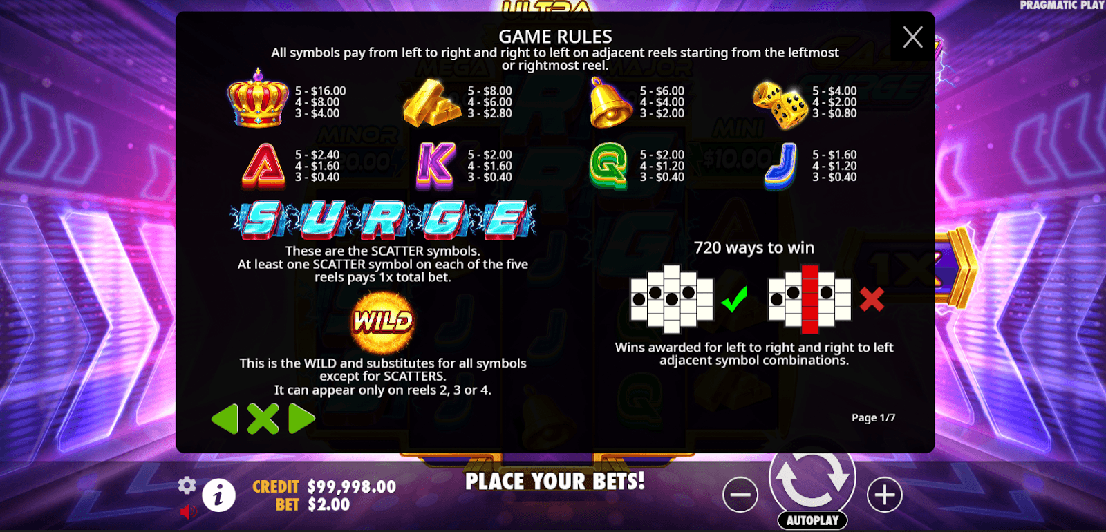 يبلغ متوسط الدورات المجانية لـ SURGE 1 من 233 دورة، لذا تمنحك هدايا الاشتراك المجانية فرصًا إضافية لتهجئة S-U-R-G-E دون الانغماس في محفظتك. نحن نفضل المواقع التي تعمل بنسبة 96.52٪ من RTP الكاملة وتضع حدًا أقصى عادلًا لسحب الأموال.